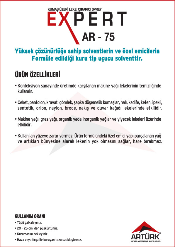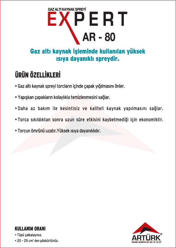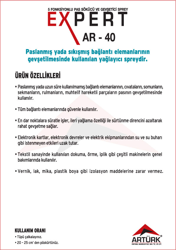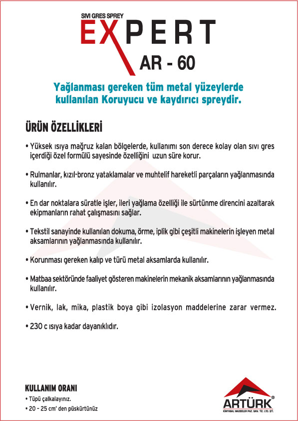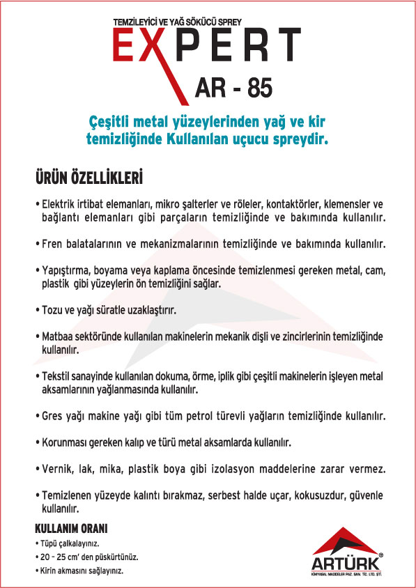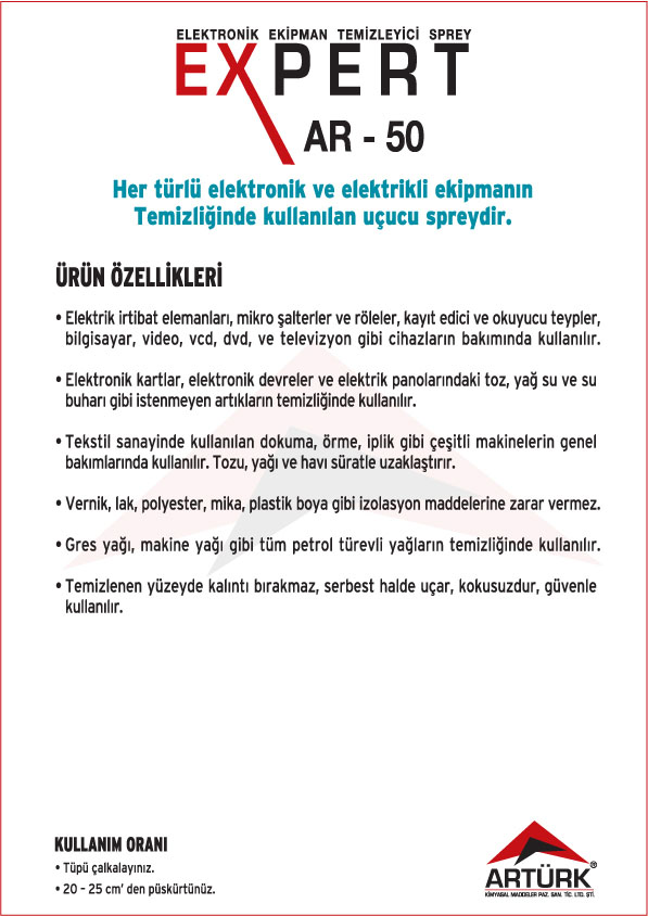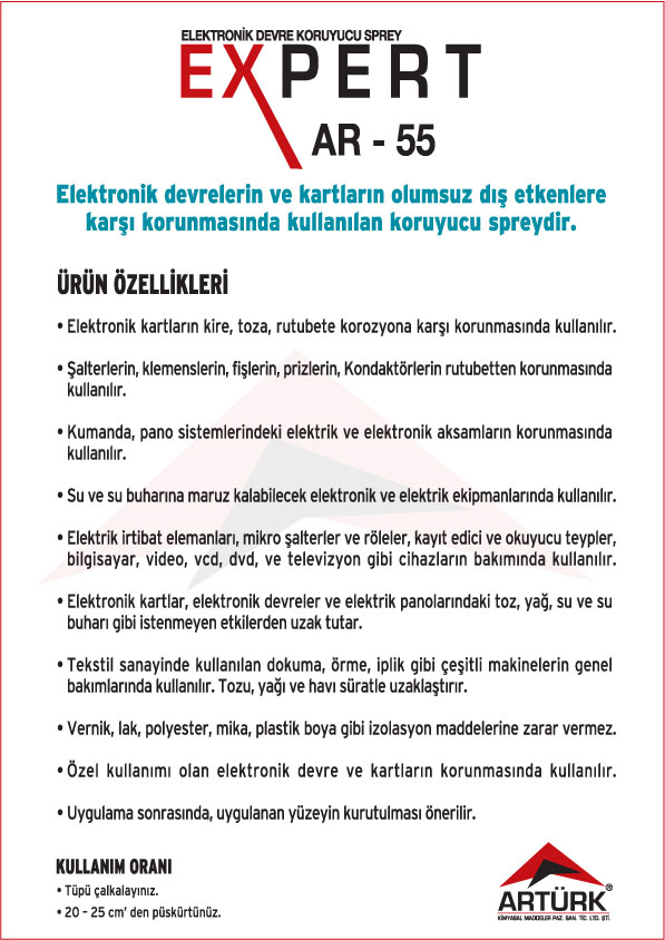 EXPERT Ürün Serisi ; Elektronik Kart Temizleyici ve Koruyucu Aerosoller, Pas Gevşetici Aerosoller, Yağlayıcı Aerosolleri, Gaz Altı Kaynağı Aerosolleri, Leke Sökücü Aerosoller, Yağsızlaştırıcı ve Temizleyici Aerosoller, Ayırıcı Silikon Aerosoller, Korozyon Önleyici ve Koruyucu Yağlar .